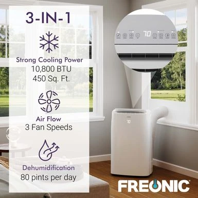 There is a fine line between form and function, and our Freonic Portable Air Conditioner is just that. This balance makes the air conditioner perfect for the modern homeowner with modern convenience in mind. Automatic louvers gently push air around the room, meaning once the unit is powered on, your work is done. Adaptive controls respond quickly to a simple touch and the unit’s soft glow shine through plastic LED displays the temperature without taking away from the polished look of the unit. With 3 cooling speeds and suitability for a room up to 450 sq. ft., the unit will make a noticeable difference within minutes of activation. To increase comfort even more, the unit comes with built-in bucketless dehumidification capabilities of removing up to 80 pints per day. Energy Saver mode is an option for when you’re out as the unit only circulates air when it senses a change in temperature instead of running continuously. The unit is also easily installed with included installation kit, and easily maintained with a washable mesh filter.