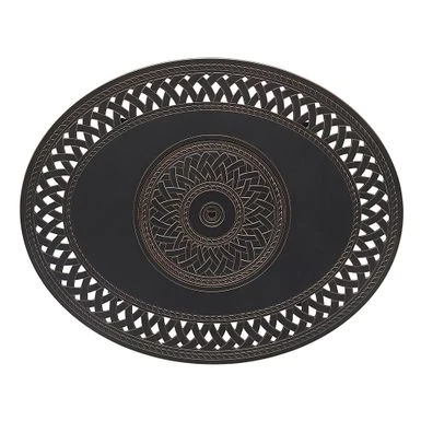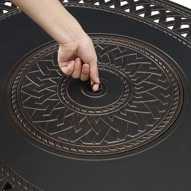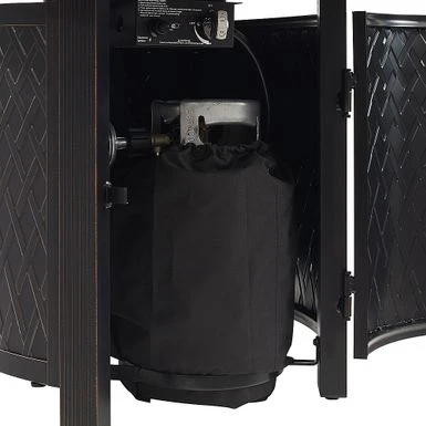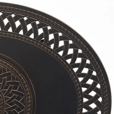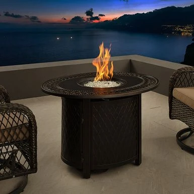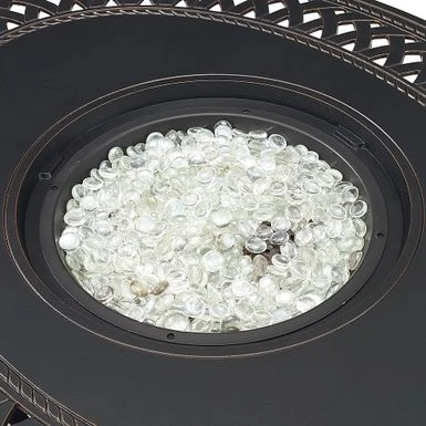 The James Oval Aluminum Gas Fire Pit shows off an open-weave pattern and burnished antique bronze finish, compatible with traditional and contemporary outdoor décor. With a practical aluminum build and an adjustable full-flame output of 37,000 BTU, this versatile and compact fire pit pulls double duty as a patio table when covered with the included fire bowl lid. Arriving with clear fire glass droplets for a sparkling accent, just add a standard 20 lb propane tank behind the handy hinged door. A weather-resistant cover for the fire pit is included for your convenience.