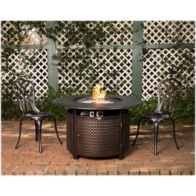 Provide a campfire setting in your outdoor space without the smoldering embers using this Fire Sense Weyland LPG fire pit. The round hammered aluminum conveniently handles the maximum 50,000 BTU blue-flame output, while the antique bronze finish of this Fire Sense Weyland LPG fire pit provides a polished look for a timeless appearance.