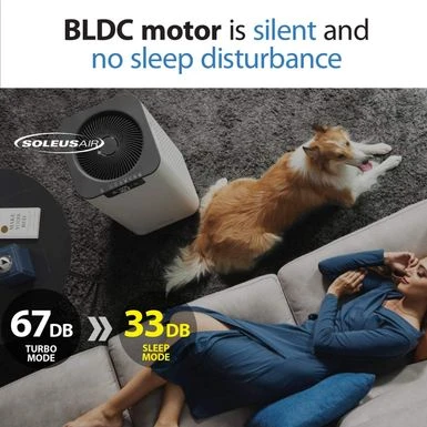 Breathe in the fresh air your home deserves with the Soleus Air Whole House Air Purifier’s 4-stage True HEPA filtration system that sucks dust, pet dander, and allergens right out of the air. Breathe in the fresh air your home deserves with the Soleus Air Whole House Air Purifier’s 4-stage True HEPA filtration system that sucks dust, pet dander, and allergens right out of the air. With a noise level of just 33 dB, the Soleus Air Whole House Air Purifier provides purified air at the volume of a whisper. With Alexa compatibility, you can change between the unit’s settings from anywhere in the house. A high CADR rating means this powerful air purifier delivers coverage to large-sized rooms up to 980ft2. Combining all these features with a laser that continuously measures air quality and automatically adjusts the unit’s settings makes the Soleus Air Whole House Air Purifier the ultimate solution for purified air throughout the home.